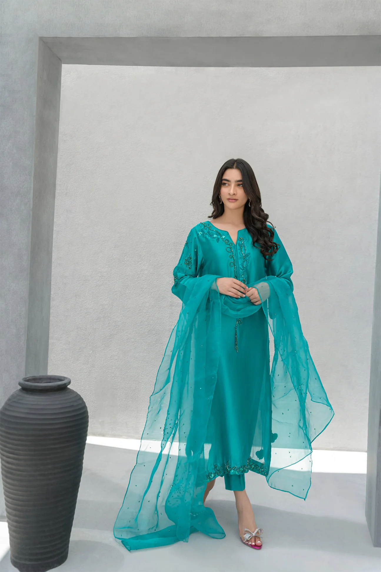 Step into ethereal elegance with our Aqua Green ensemble, where every detail speaks of grace and sophistication. Crafted from pure sheesha silk fabric, both the shirt and pant feature exquisite work in the same serene green hue, adorned with shimmering stones and sequins for a captivating effect. Adding a whimsical touch, tassels hang delicately from the hemline, embellished with enchanting 3D butterflies. Completing the ensemble is a pure sheesha organza dupatta, lending an air of lightness and beauty to the overall look. This ensemble is a true celebration of refined style and timeless allure, perfect for any special occasion.