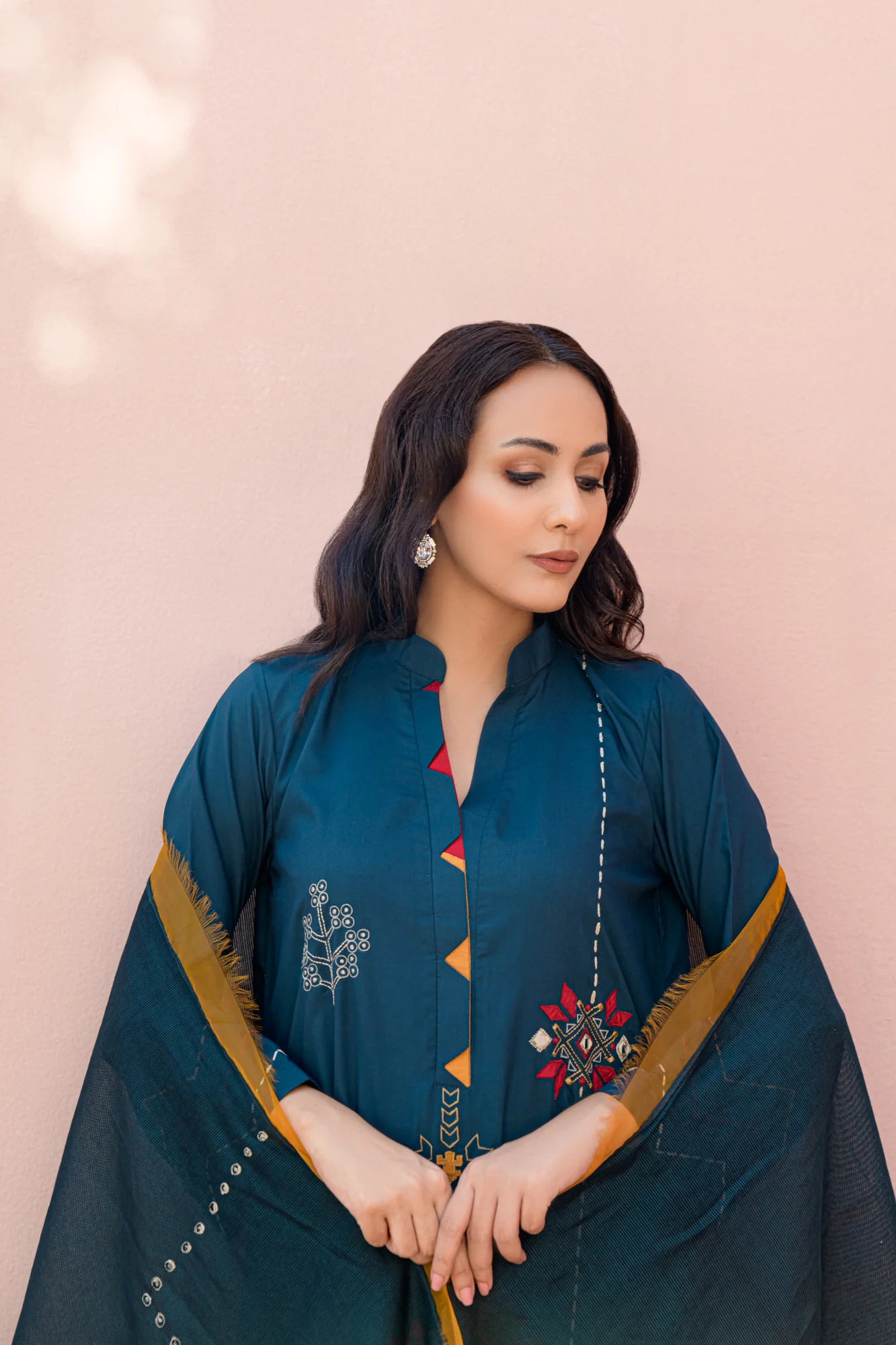 Azalea- teal blue coloured 3-piece set with embroidery and a modern cut. this set includes a straight cut long shirt, wide cullote pants and a net organza duppata.