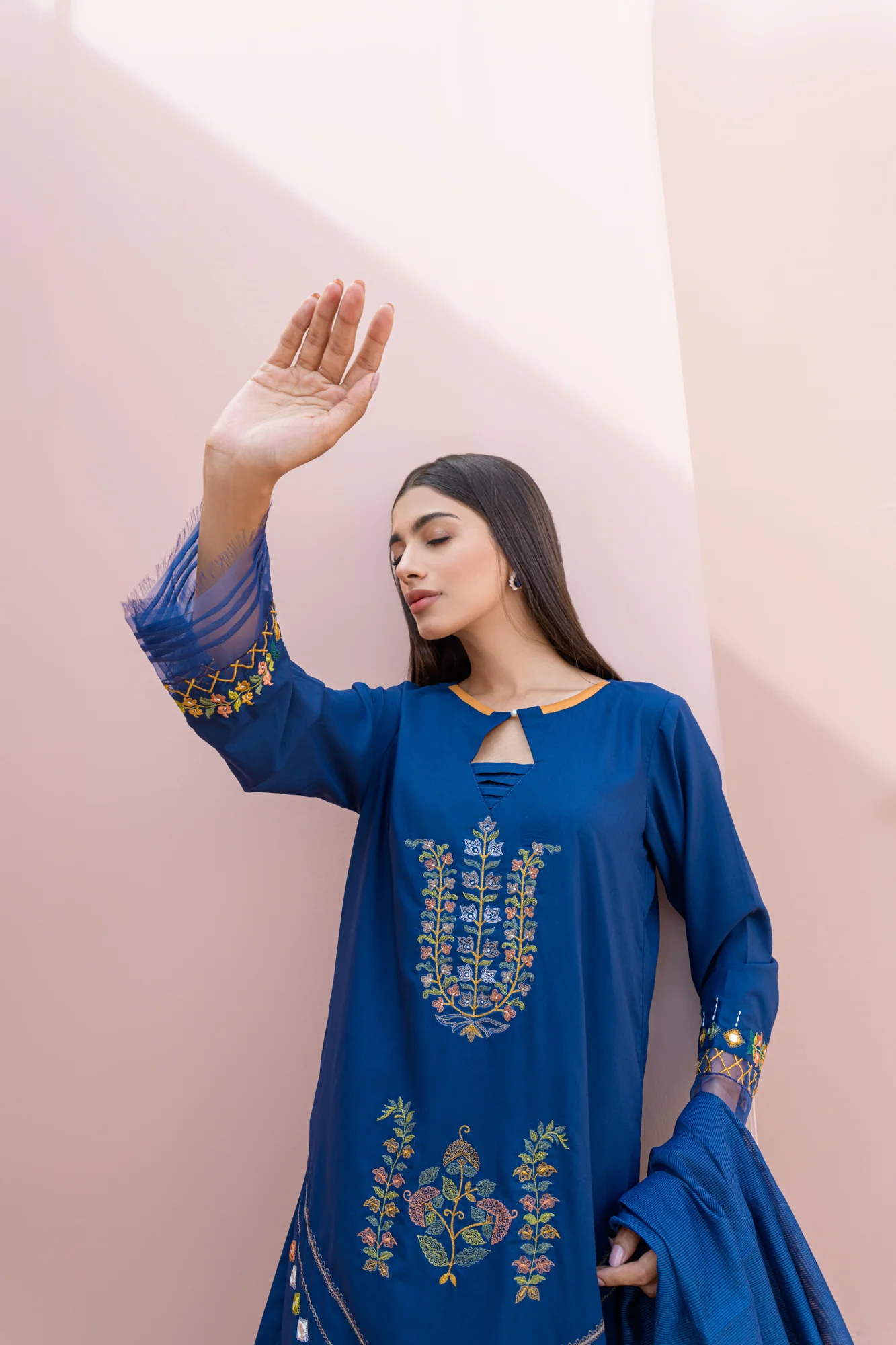 Azzure- Royal blue coloured 3-piece set with cutwork embroidery and a modern cut. this set includes a straight cut shirt, narrow straight pants and a net organza duppata.