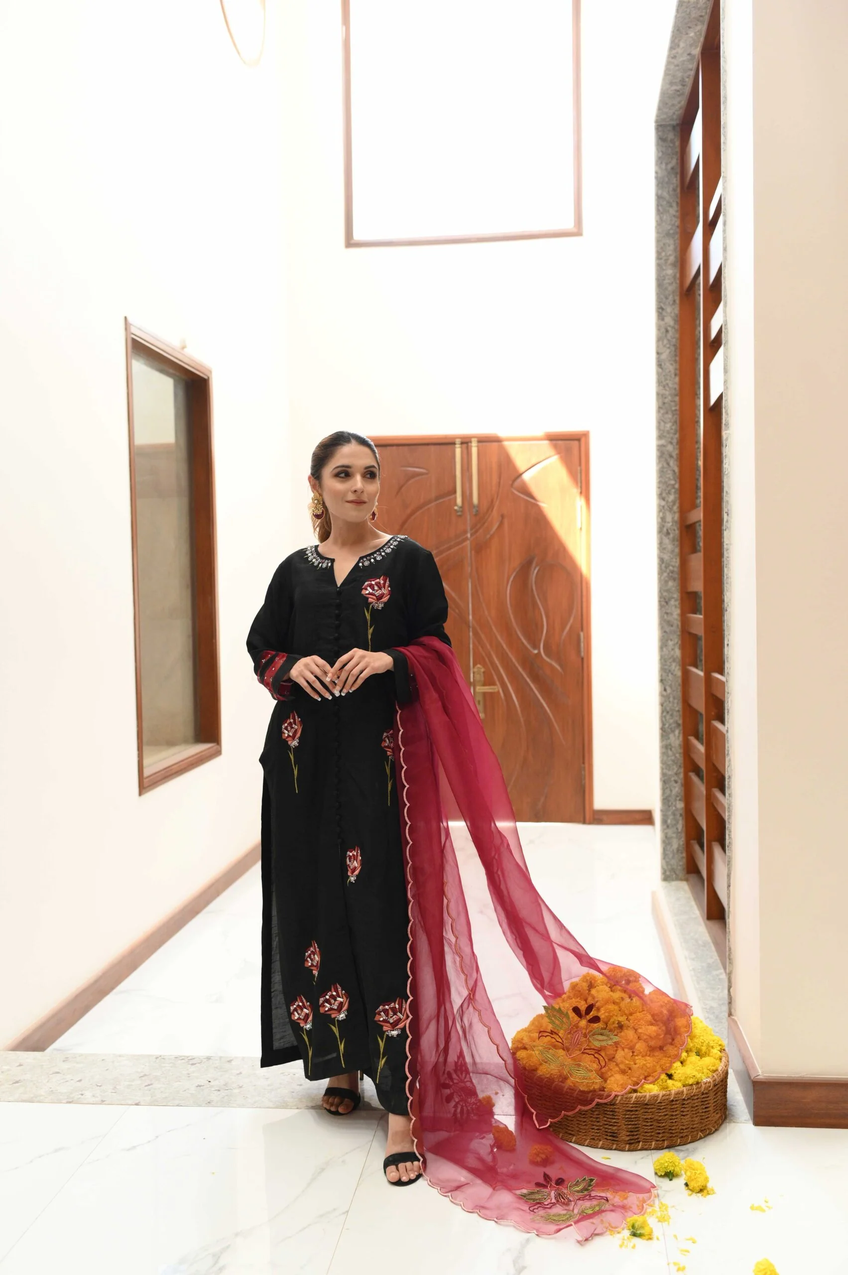 It is made from high-quality raw silk, which is known for its natural texture and lustrous appearance. The shirt is in a stunning emerald black color, representing elegance and sophistication. The shirt is adorned with intricate maroon tulip flowers creating sophistication and elegancy.