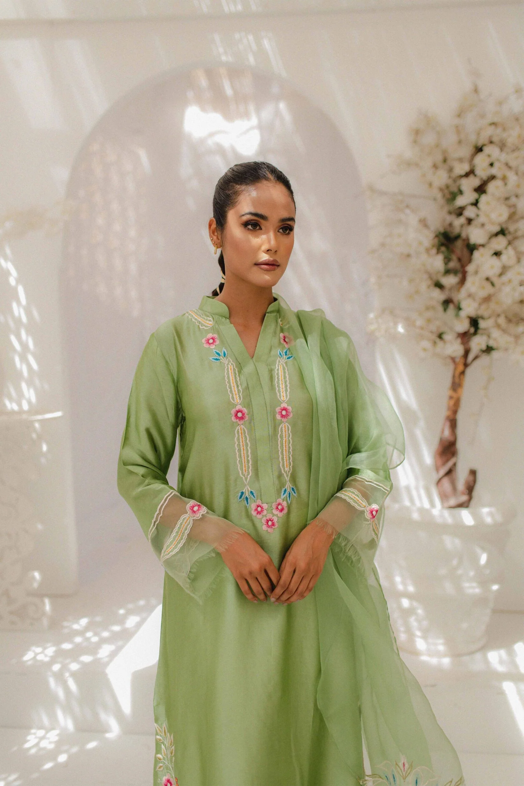 The light green dress is designed with a straight-cut shirt, giving it a sleek and elegant silhouette. It is made from pure silk, which adds a luxurious and lustrous quality to the fabric. The dress features pastel-toned machine work, delicately embroidered onto the fabric. To complete the ensemble, the dress is paired with a white izaar. The izaar is a flowing garment worn as a lower garment, typically draped around the waist and legs, often associated with traditional South Asian clothing. The white color of the izaar provides a contrasting element against the light green dress, creating a visually appealing and balanced look.