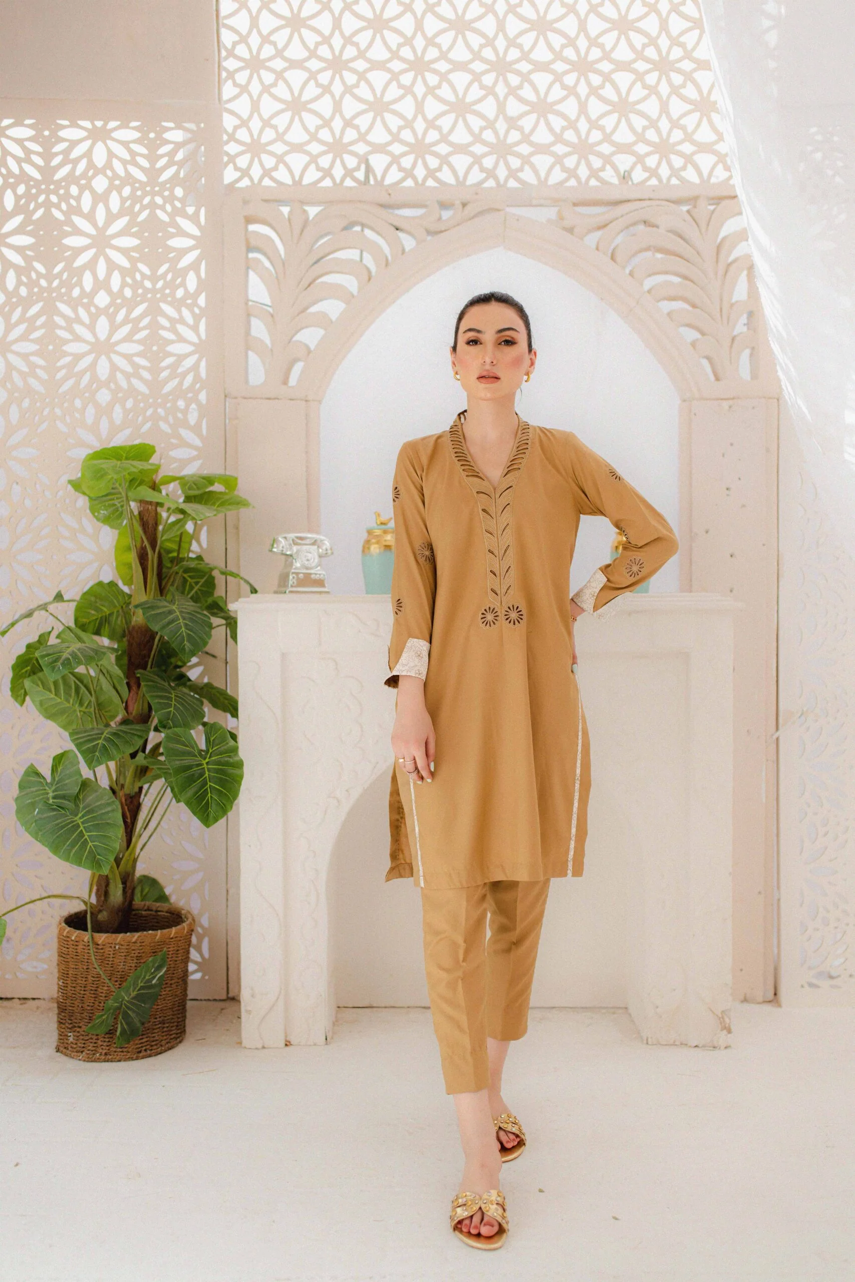 Eva- Mustard coloured 3-piece set with cutwork embroidery and a modern cut. this set includes a straight cut shirt, narrow straight pants and a net organza duppata.