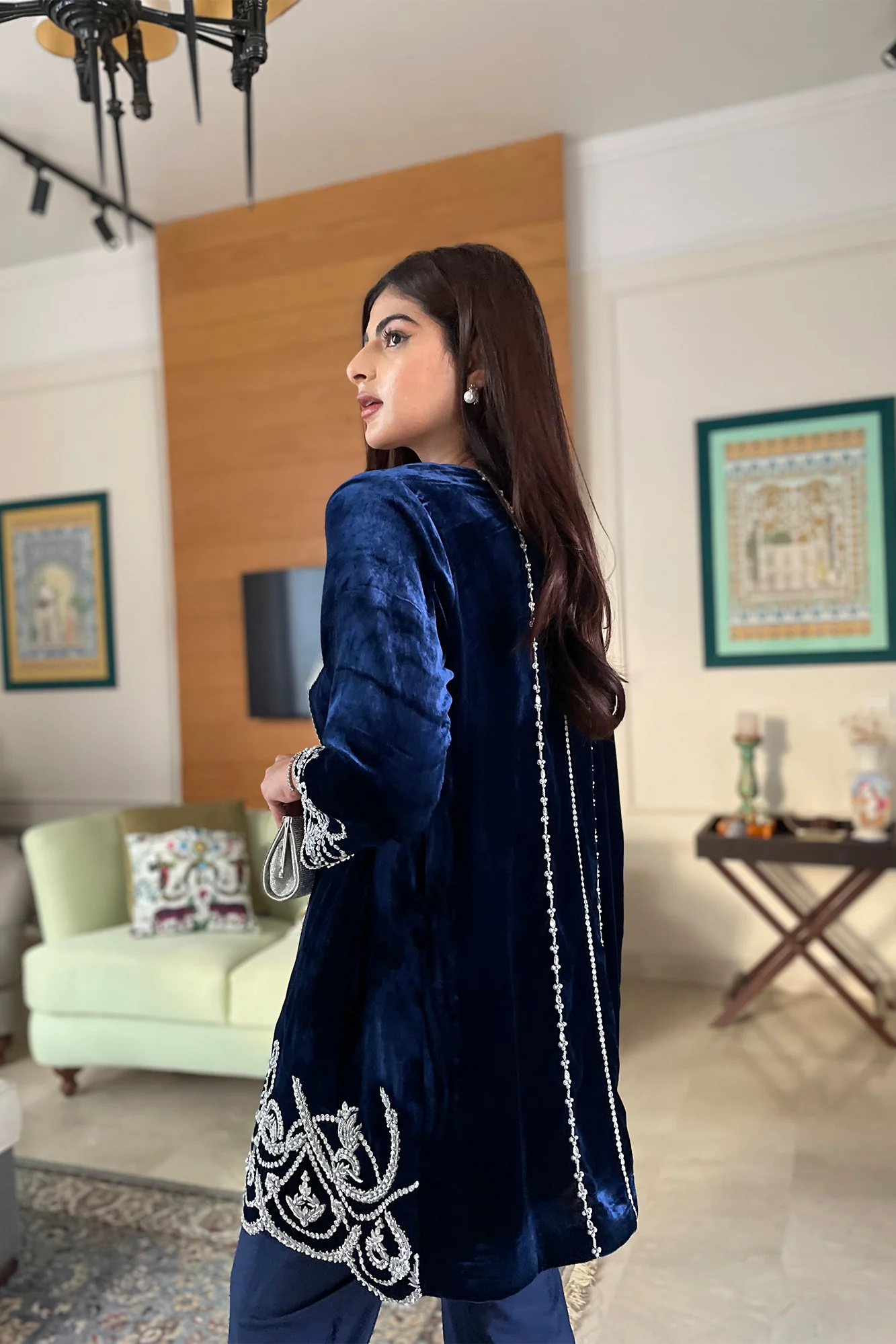 The electric blue short jacket with wide fit cullots. The entire outfits consists of silver handwork with swaroskis and pearls to enrich the look of the outfit. -colour of the article may vary from the picture.