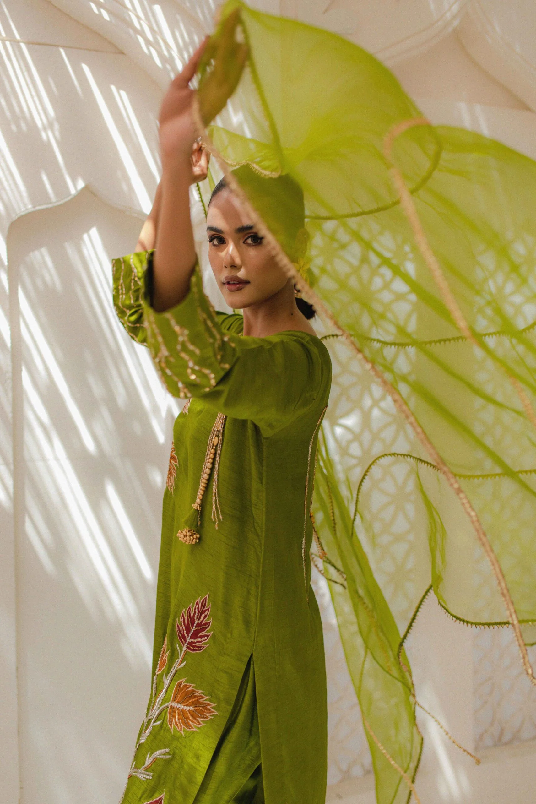 The dress features a refreshing lime green color, creating a bold and eye-catching look. It is made from a high-quality fabric that drapes elegantly and enhances the overall appearance. The fabric has a subtle sheen, adding a touch of sophistication to the dress. It is designed with a rounded neckline, which is adorned with exquisite featherwork and delicate tassels. The featherwork adds a unique and playful element. The pink and rust embroidery is the highlight of this dress. Intricately crafted, the embroidery showcases a beautiful combination of pink and rust-colored threads.