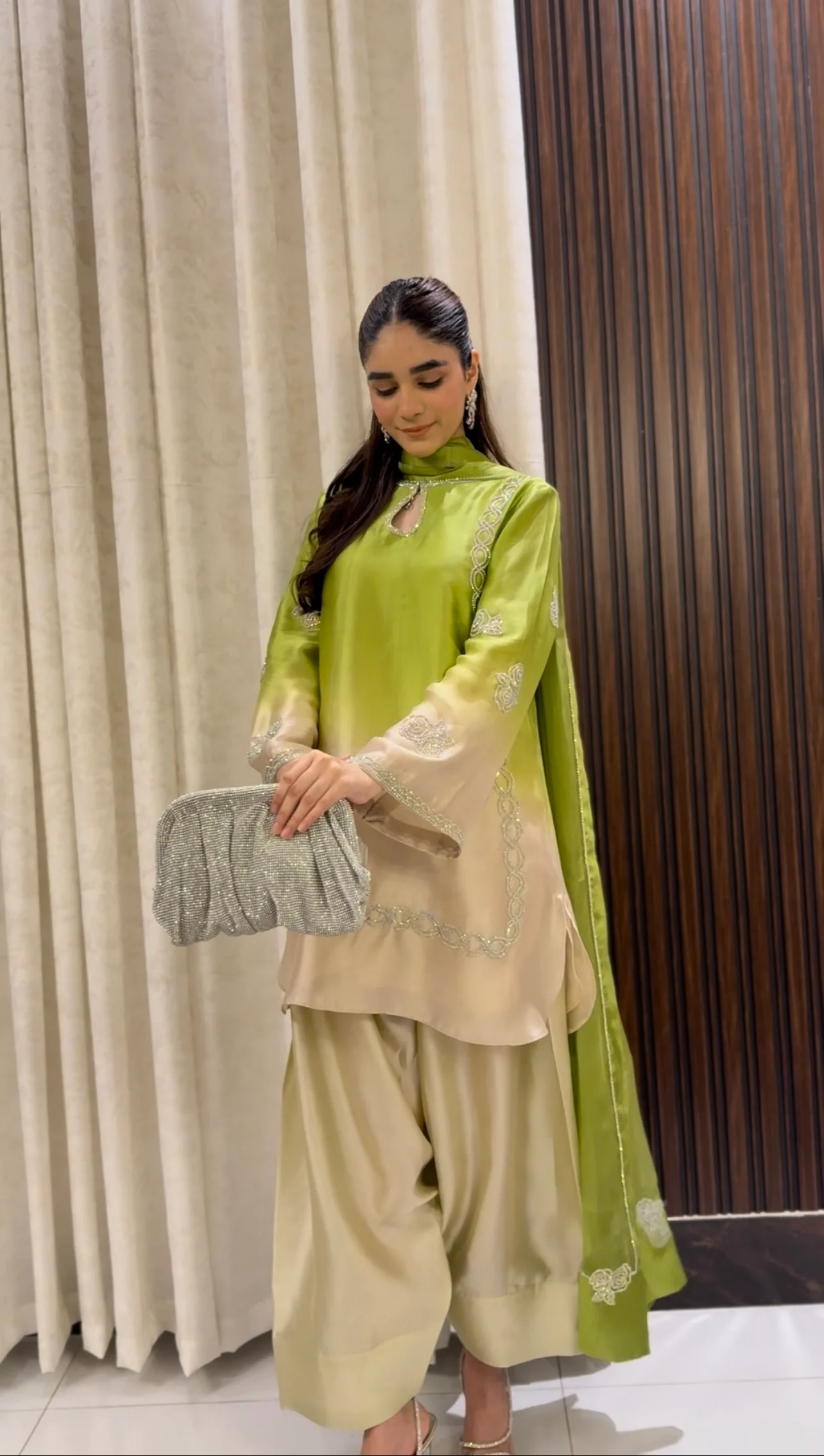 Kiwi 2.0 is an upgraded rendition of our classic Kiwi design from the Freya festive collection. This stunning ensemble features a stylish short kameez paired with traditional old-school shalwar, all meticulously crafted from luxurious pure sheesha silk. The look is elevated with a pure sheesha organza dupatta adorned with intricate Swarovski and stone embellishments, making it a perfect choice for festive occasions.
