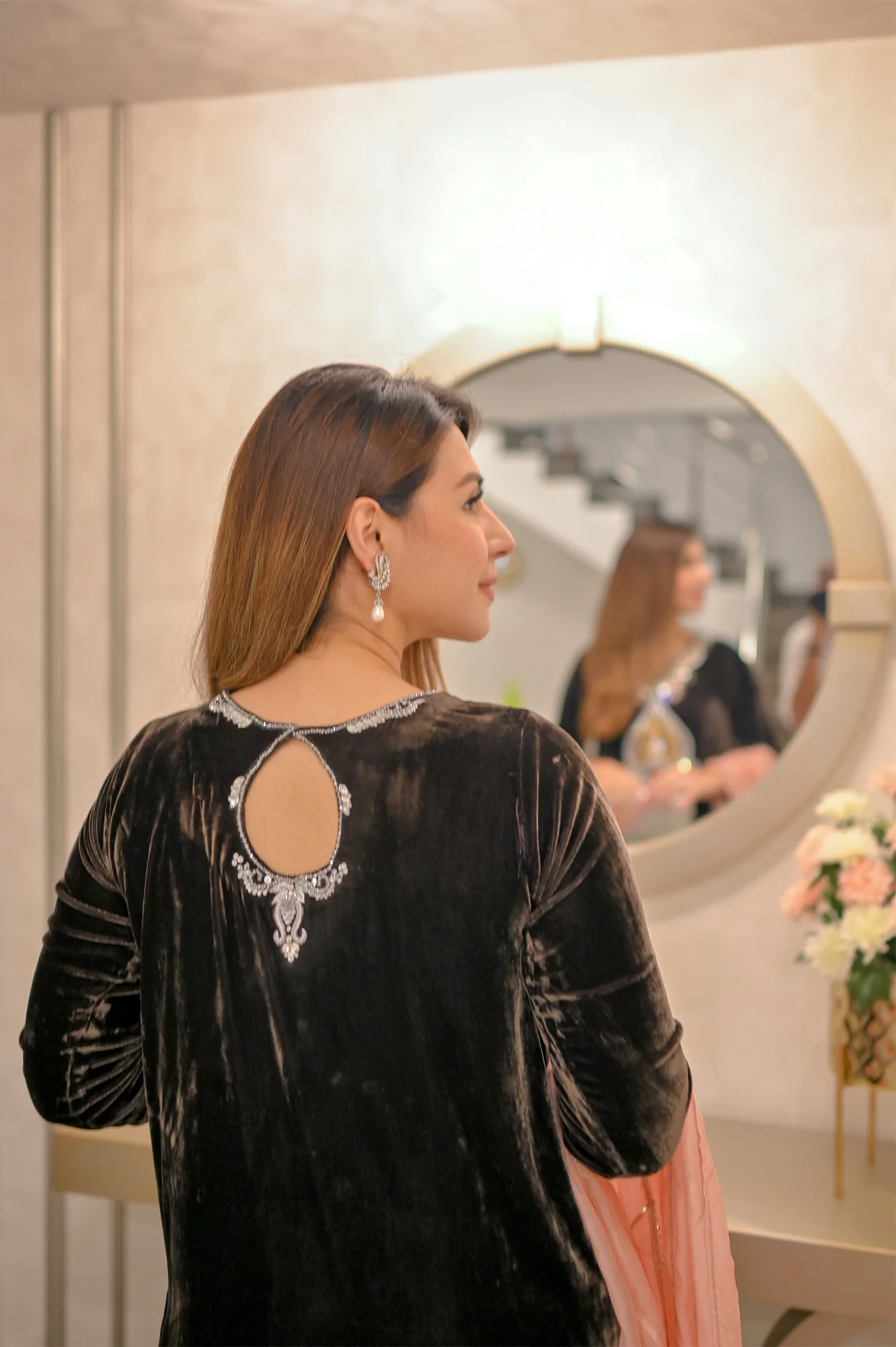 Lalain- the brown velvet set with gold lama loose-cut pants and a peachy coral dupatta. All the work done is handworked with tassels, applique and Swarovski. -colour of the article may vary from the picture.