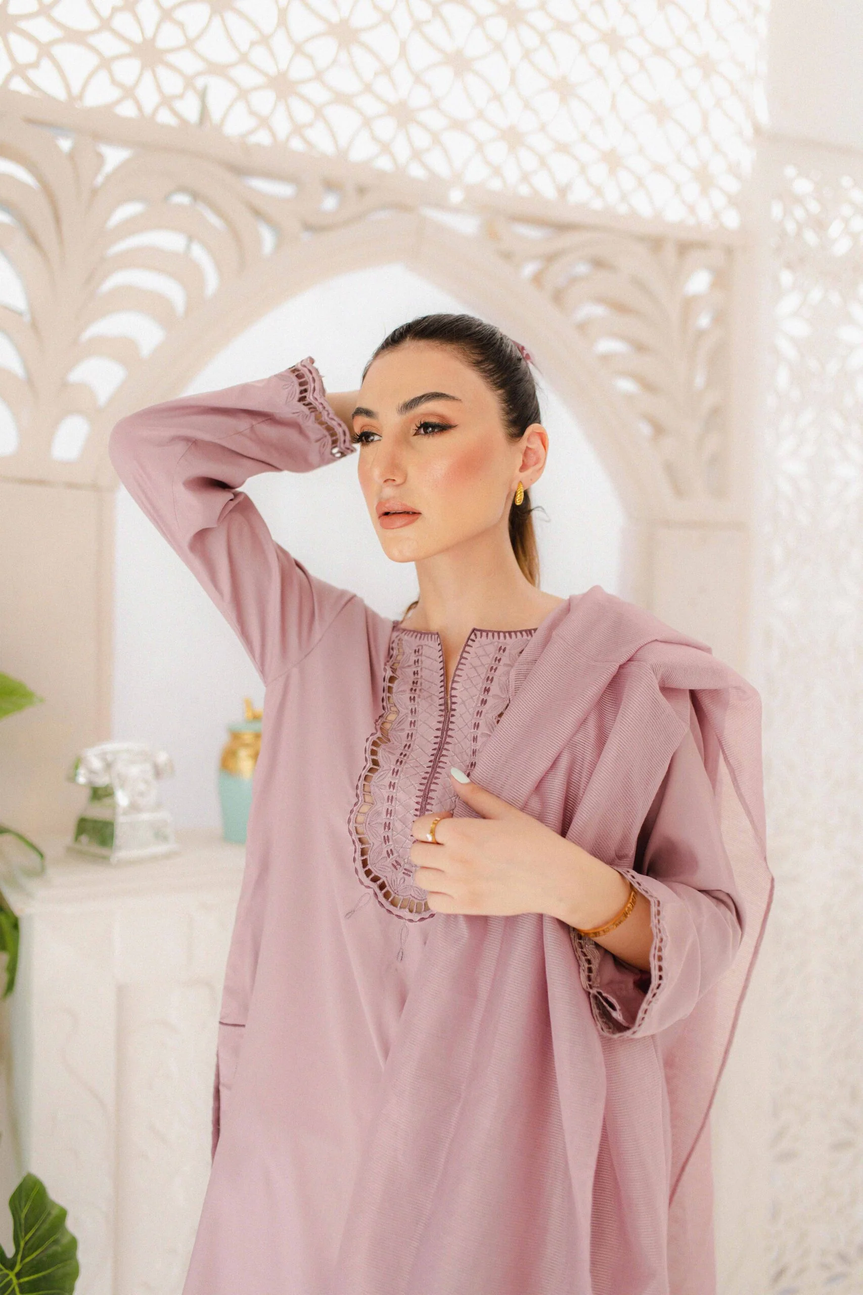 Lavender Bloom- lavender coloured 3-piece set with cutwork embroidery and a sleek cut. this set includes a straight cut shirt, narrow straight cut pants and a net organza duppata with flower work on it.