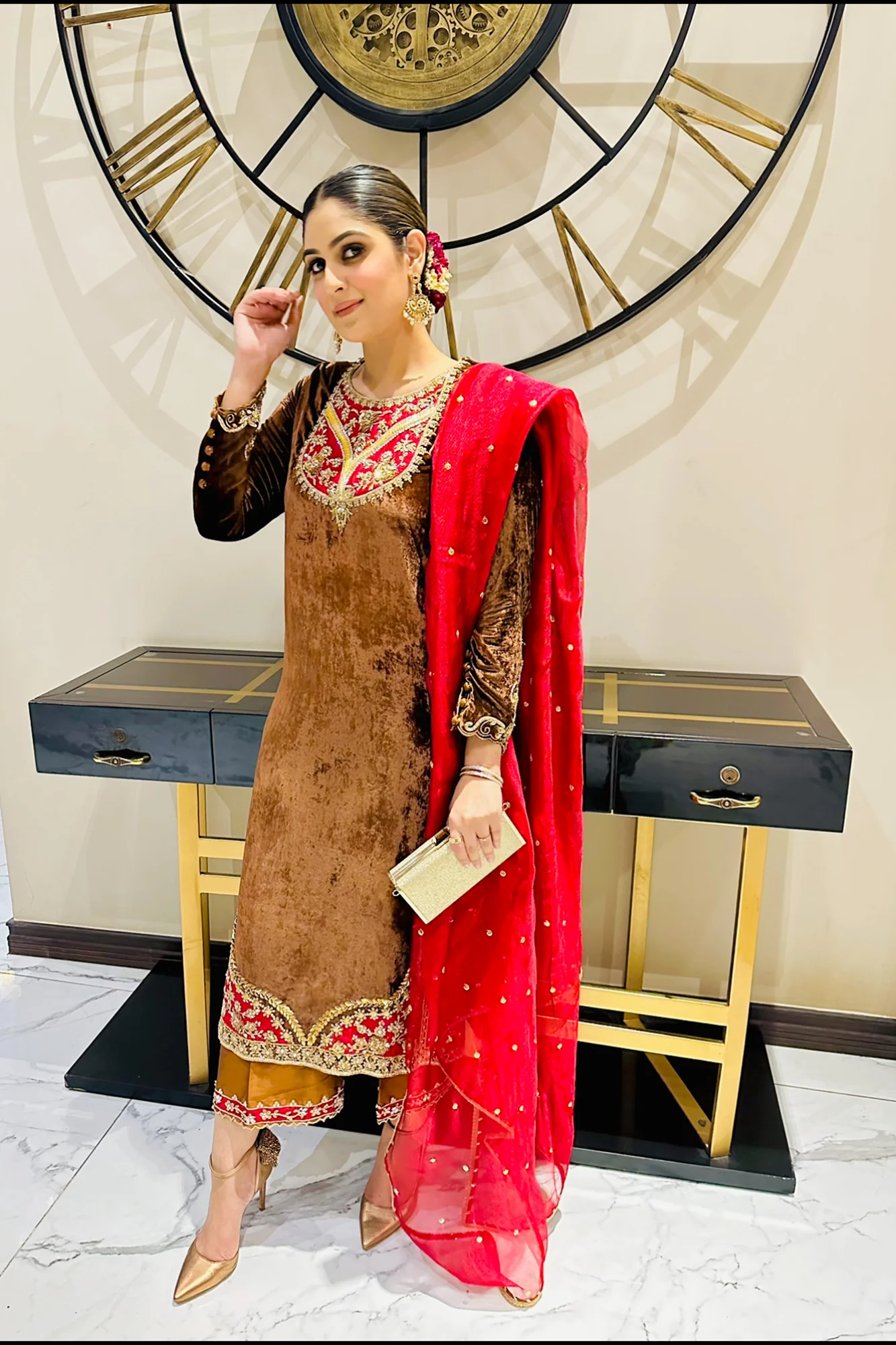 Aania looks ravishingly beautiful in this dull brown attire with maroon duppata. She carried it gracefully with a sleek tied bun that compliments the entire look. The dress consists of maroon applique handwork on the daman with a crisscross pattern. Wide izaar is an additional feature that compliments the entire look. -colour of the article may vary from the picture.