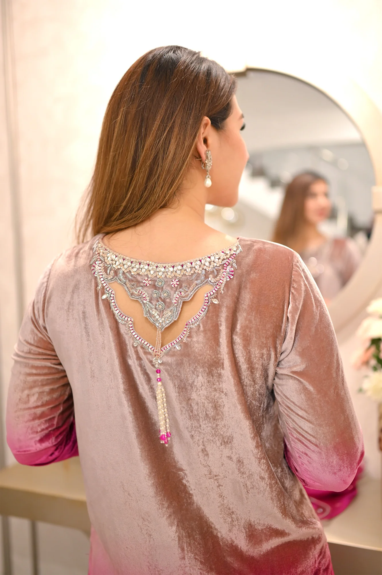 The two-toned velvet shirt in the shades of mauve and pink is a trendy wear this wedding season. The work on the hemline and border compliments the look. It consists of narrow-cut straight pants and a cotton net dupatta. -colour of the article may vary from the picture.