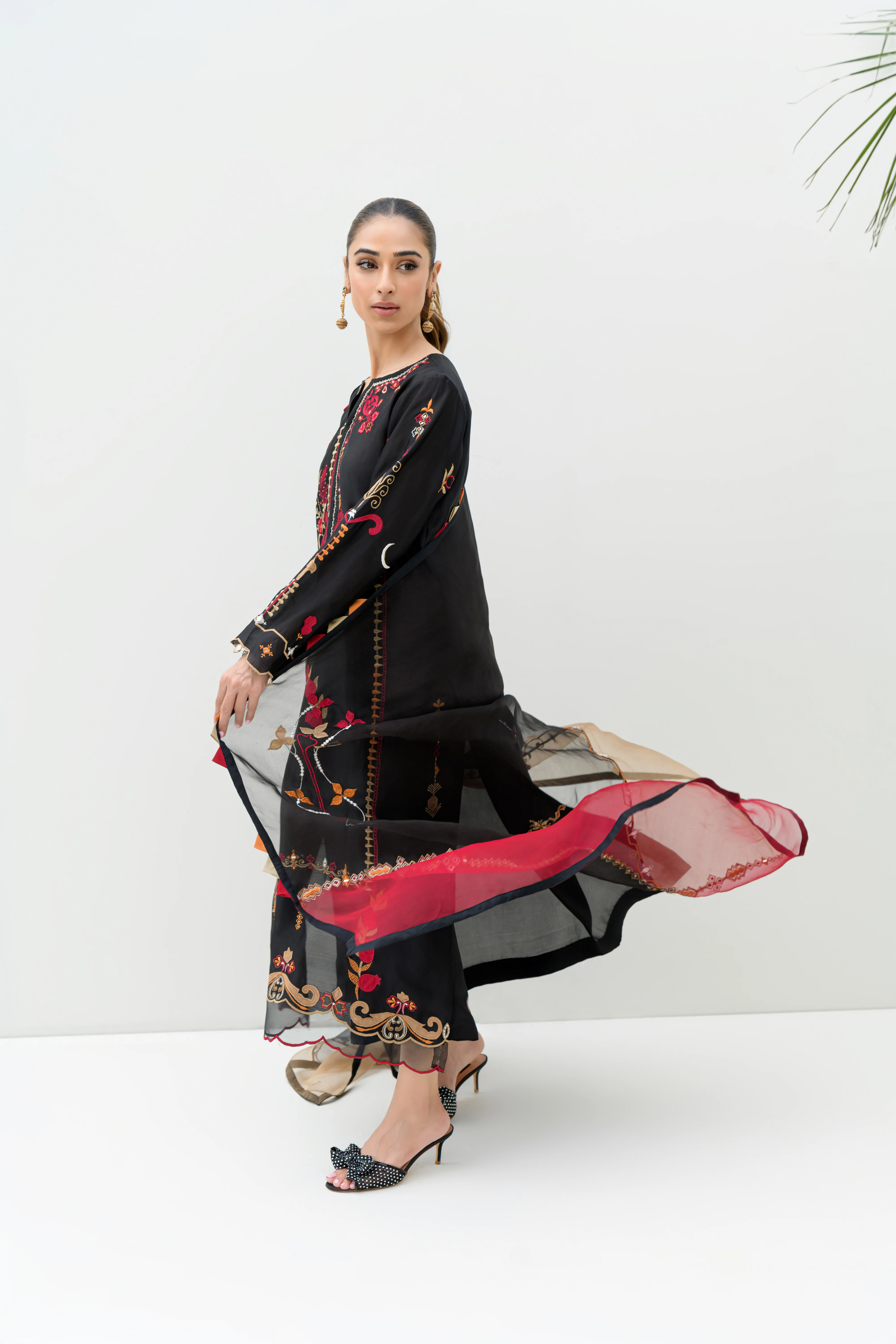 The Marvi dress masterfully combines traditional and modern elements in a striking design. Featuring a sophisticated palette of cranberry red, coal black, and coffee beige, this ensemble is crafted from premium pure sheesha silk for the shirt and izaars, and pure organza for the dupatta. The dress is adorned with a variety of techniques, including appliqués and mirror work, showcasing intricate craftsmanship and a contemporary flair. This carefully designed attire offers a refined blend of classic elegance and modern sophistication.
