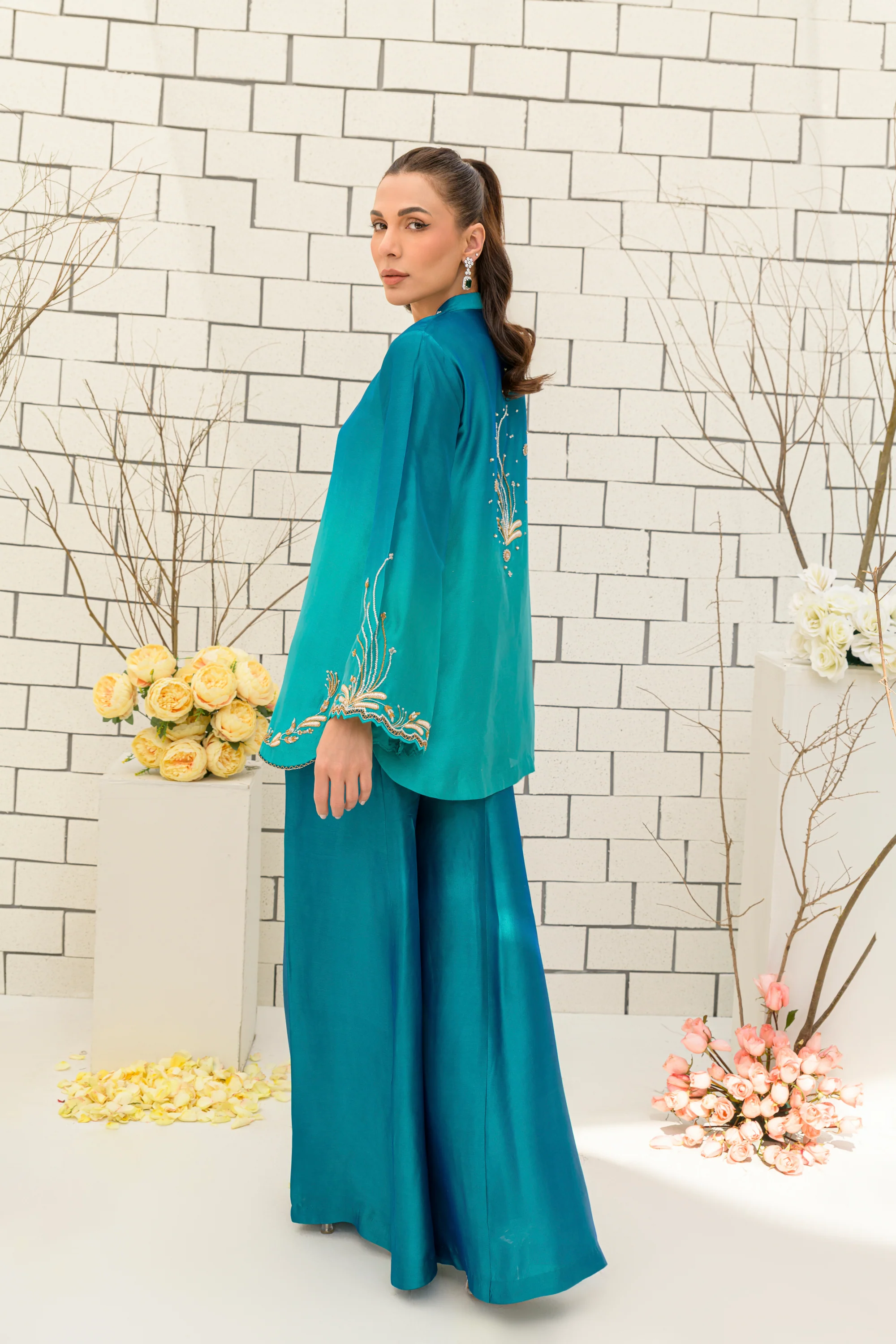 Crafted from premium pure sheesha silk, Matcha exudes effortless charm and sophistication. This ensemble features a sea green ombre short-cut jacket adorned with intricate handwork of dabka, kora, and Swarovski stones. Paired with flowy Dhaka pants, the design combines contemporary elegance with timeless craftsmanship. The delicately embellished jacket adds a playful yet refined touch, making it a standout piece for any occasion.