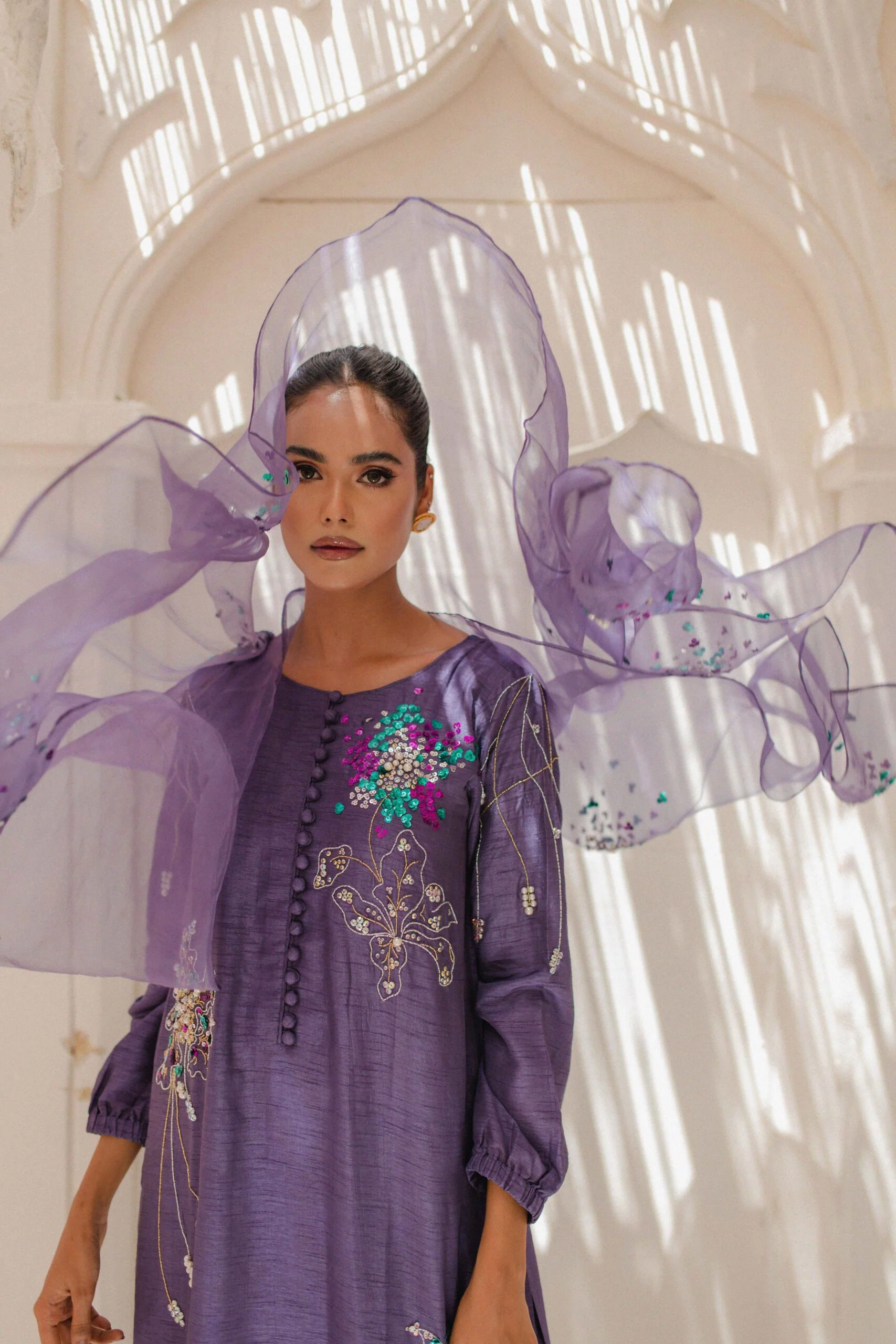 The lavender short shirt dress with shalwar is a stunning ensemble crafted from pure silk fabric. The dress features a short shirt-style top that falls gracefully above the knees, creating a chic and contemporary silhouette. One of the most captivating aspects of this dress is the intricate handwork of sequins in flower embroidery. Delicately placed sequins create a mesmerizing floral pattern that adorns the entire dress, adding a touch of glamour and sophistication. The shalwar complements the shirt dress perfectly, providing a balanced and harmonious look.
