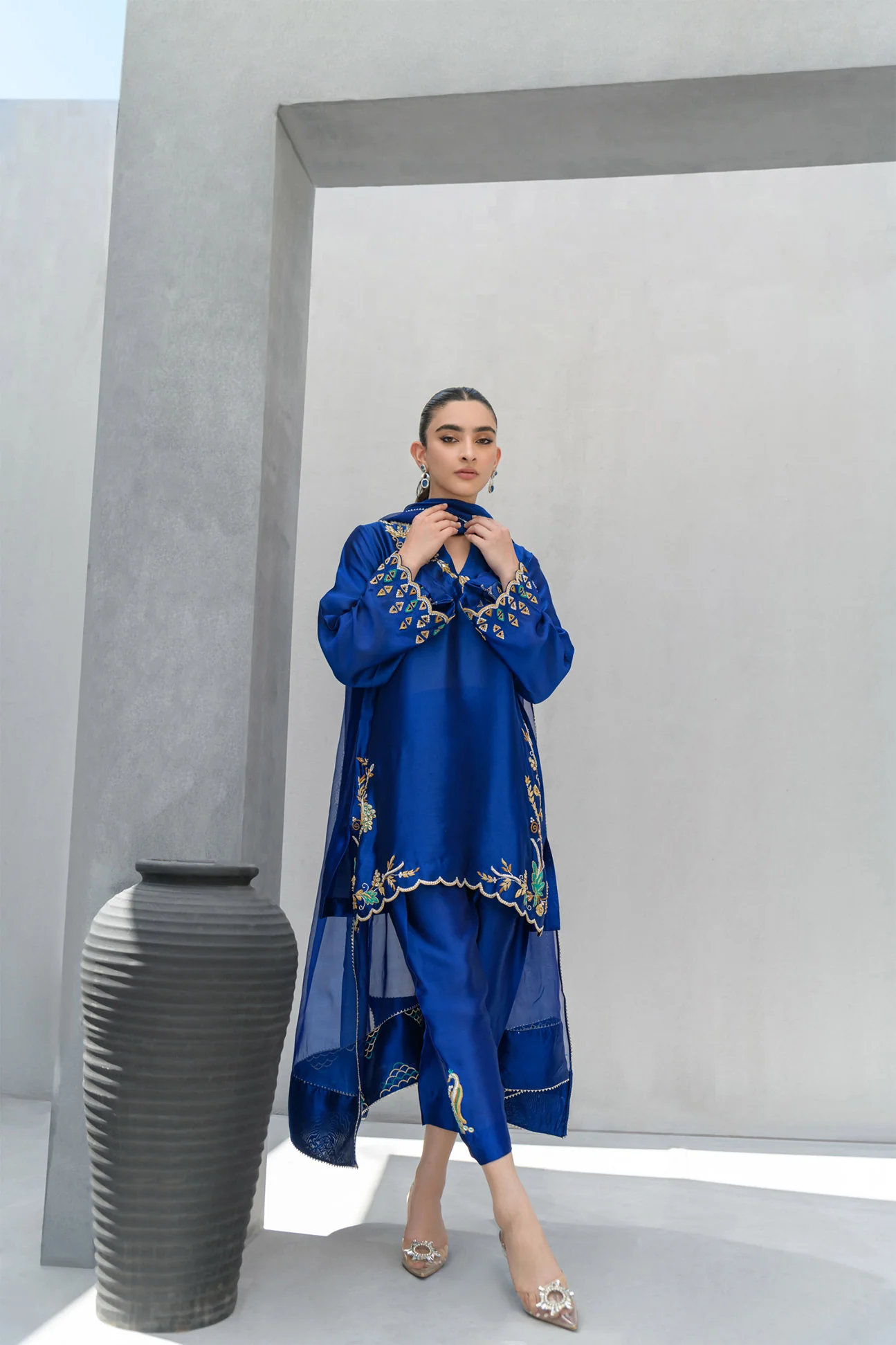 Introducing the latest fashion trend: our stunning blue sheesha silk short shirt ensemble paired with shalwar, designed to turn heads wherever you go. Featuring exquisite handwork in shades of yellow gold, peacock, and silver adorning the border, sleeves, and neckline, this ensemble exudes sophistication and charm. Complementing the look is a pure sheesha organza dupatta with intricate border work, adding an extra touch of elegance. Ideal for grand gatherings and events, it\'s the perfect choice for those seeking impeccable formal attire.