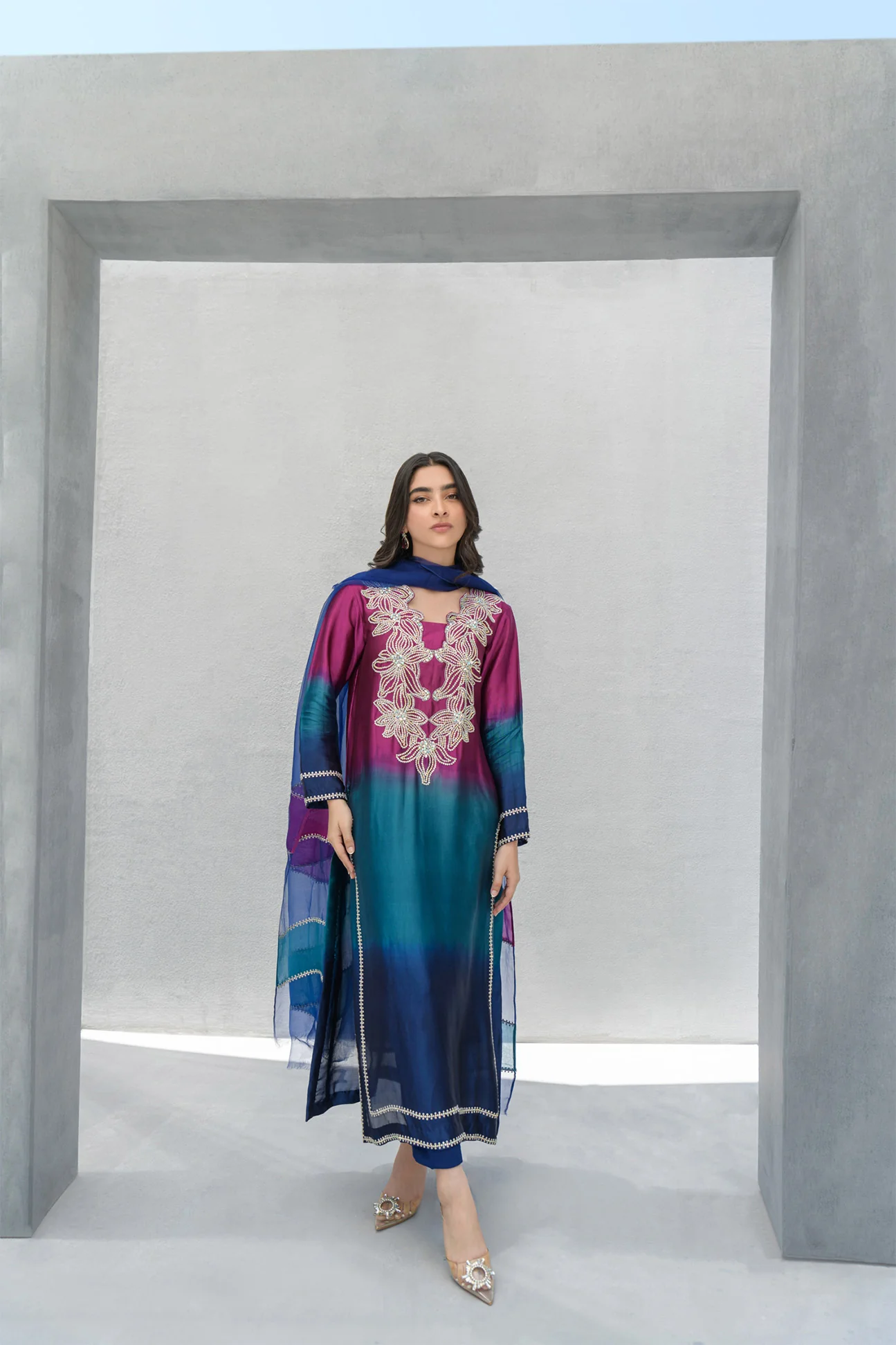 Elevate your style with our captivating Three-Toned Ensemble, seamlessly blending the rich hues of plum purple, peacock green, and royal blue for a harmonious and luxurious appeal. Crafted from premium-quality pure sheesha silk fabric, both the shirt and pants exude elegance and refinement. The meticulous blending of the three shades creates a smooth and sophisticated finish, while the pure sheesha organza dupatta mirrors this captivating color palette for a cohesive look. Adorned with exquisite Swarovski flower work, the neckline adds a touch of opulence and glamour to the ensemble, ensuring you stand out with effortless grace and charm.