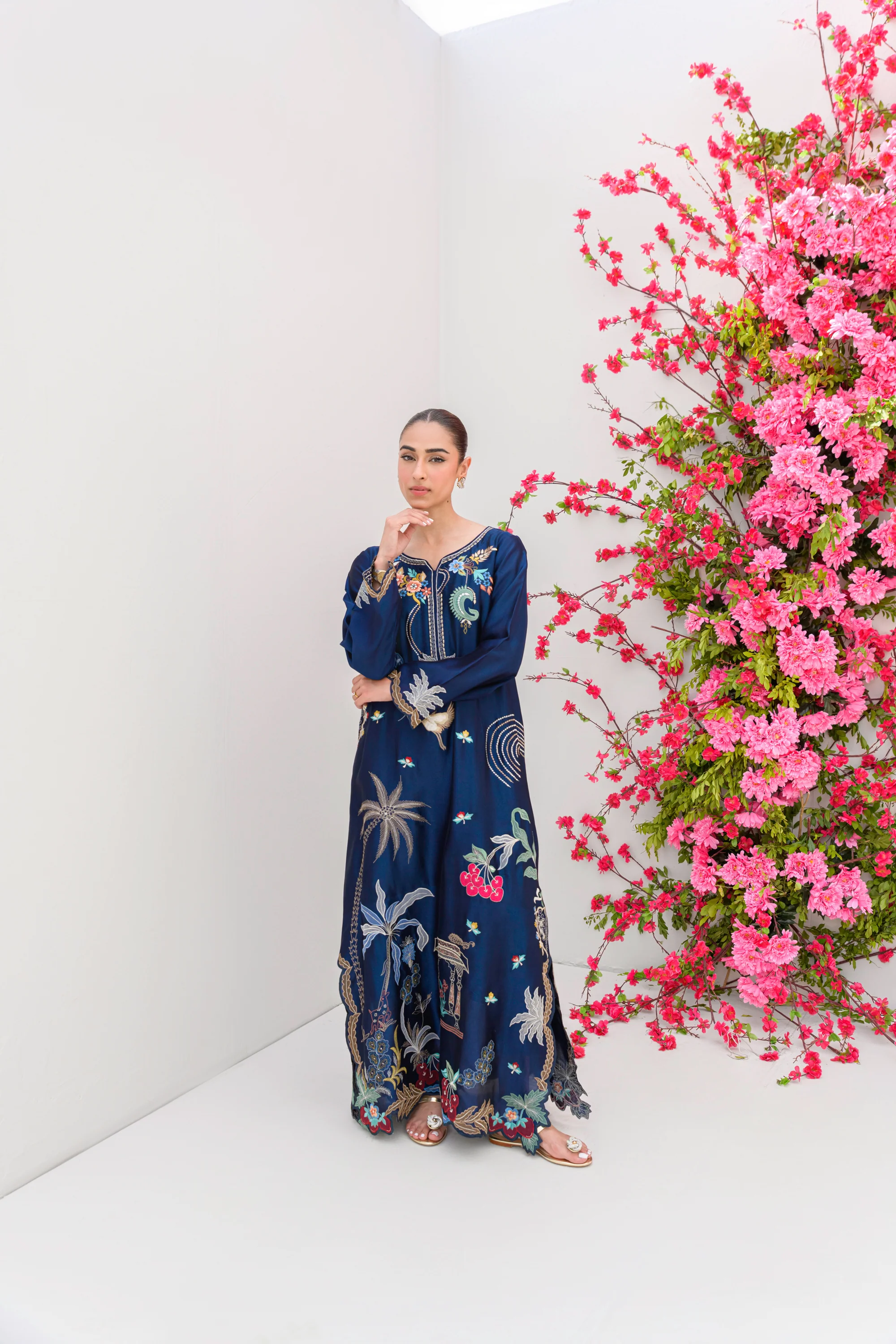 River Island is a long, pure sheesha silk kaftan featuring a stunning scenic print of palm trees, birds, cherries, and cozy shelters. Designed in a trendy, easy-breezy cut, itās perfect for effortless summer style. The deep navy blue base is beautifully accented with machine embroidery and applique work in cranberry, ice blue, and beige tones, adding an elegant touch. itās a two piece set.