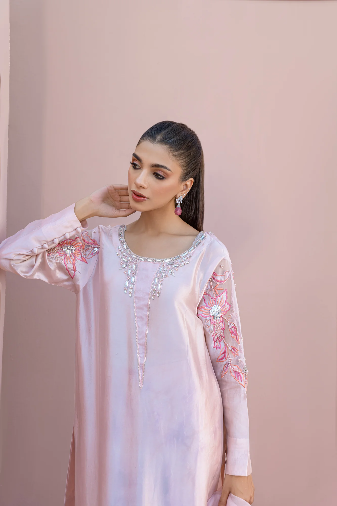 The dress features a soft shade of pink, reminiscent of a delicate rose petal. The top of the dress is adorned with intricate Swarovski crystals and lustrous pearls, adding a touch of sparkle and sophistication. The sleeves of the dress are made of organza fabric, which creates a sheer and ethereal effect. Complementing the dress, the pants are tie-dyed in various shades of pink. The tie-dye technique creates a unique and eye-catching pattern, adding a trendy and fashionable element to the ensemble.