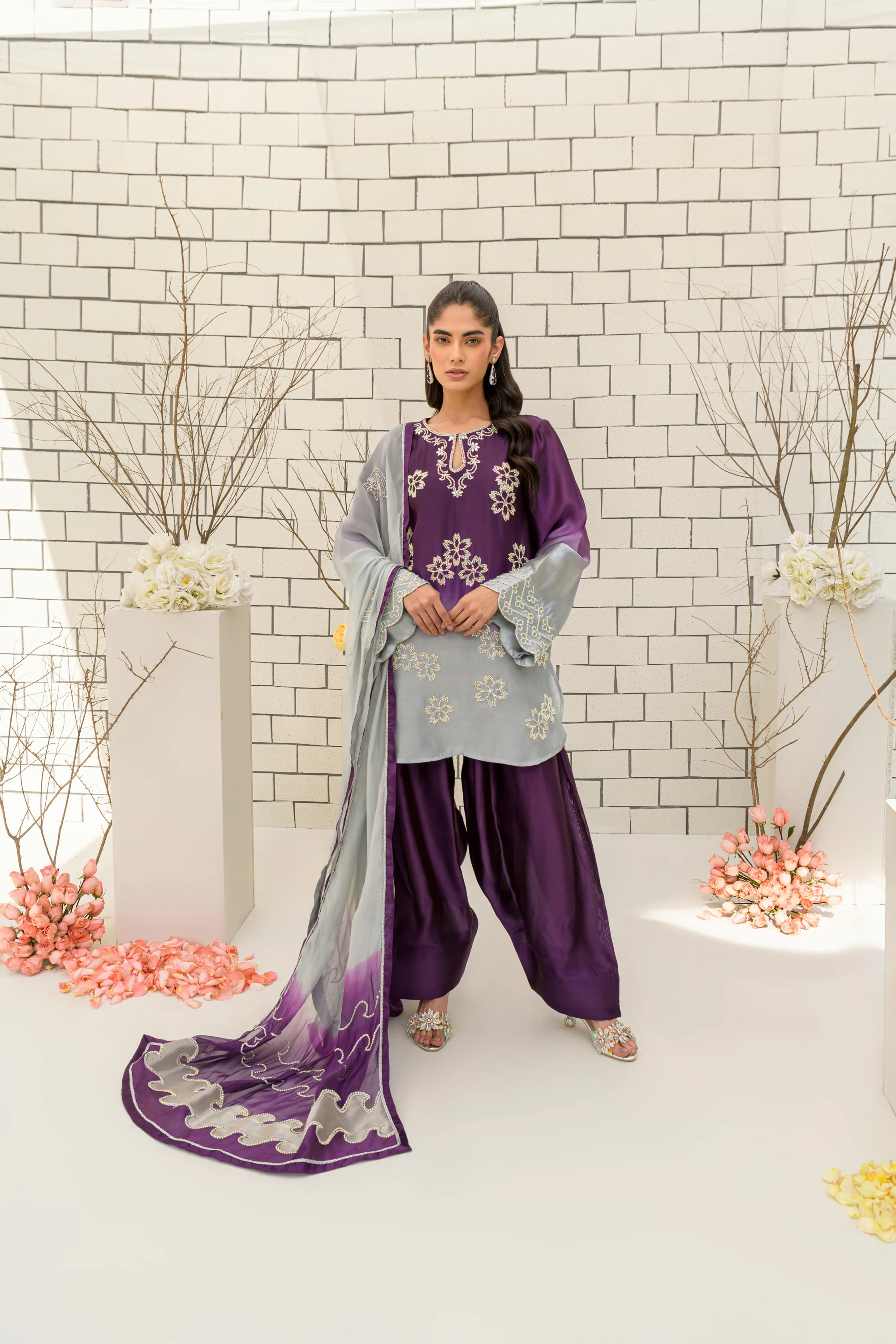 Salmon Brew combines timeless charm with modern elegance. Crafted from premium pure sheesha silk, this ensemble features a short-style shirt in harmonious shades of slate grey and plum purple, paired with a classic old-school shalwar. The shirt is beautifully adorned with Swarovski stones arranged in delicate floral motifs, adding a touch of sparkle. A pure sheesha organza dupatta, embellished with shimmering Swarovski work, completes the look. Perfect for those who appreciate understated sophistication with a contemporary twist.