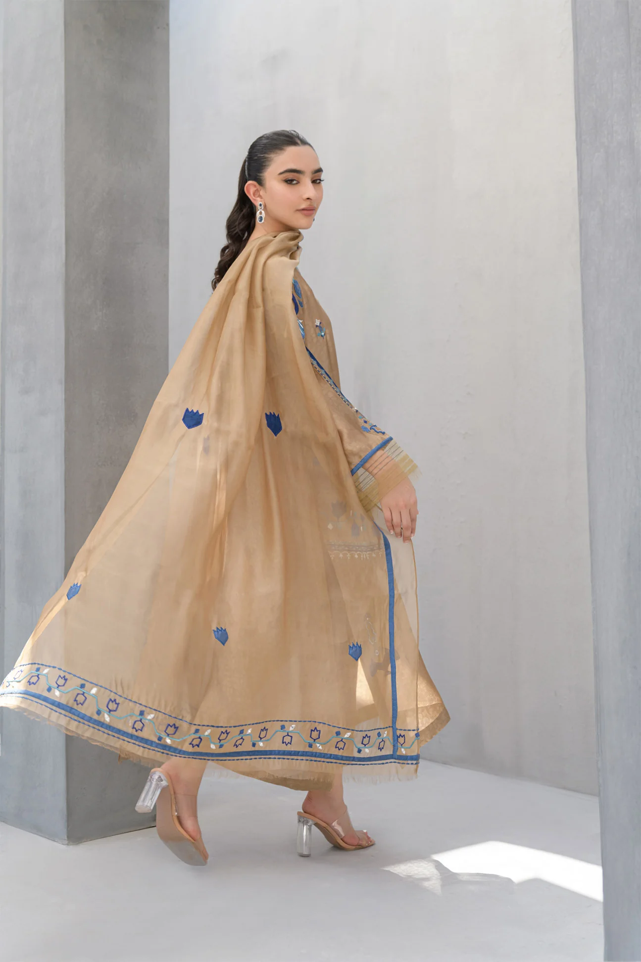Discover the epitome of timeless elegance with our Sand-Toned Self Sheesha Silk shirt, paired flawlessly with a pure Sheesha Organza dupatta. This exquisite ensemble seamlessly blends traditional craftsmanship with modern fusion. The shirt, a masterpiece of various silhouettes and intricate workmanship, features colored resham in serene shades of blue, complemented by mesmerizing mirror work and delicate lace detailing. Meanwhile, the pure Sheesha Organza dupatta boasts stunning applic work throughout, reminiscent of the ocean\'s serene hues. Embrace the allure of tradition with a contemporary twist in this captivating ensemble, perfect for those seeking refined style with a touch of sophistication