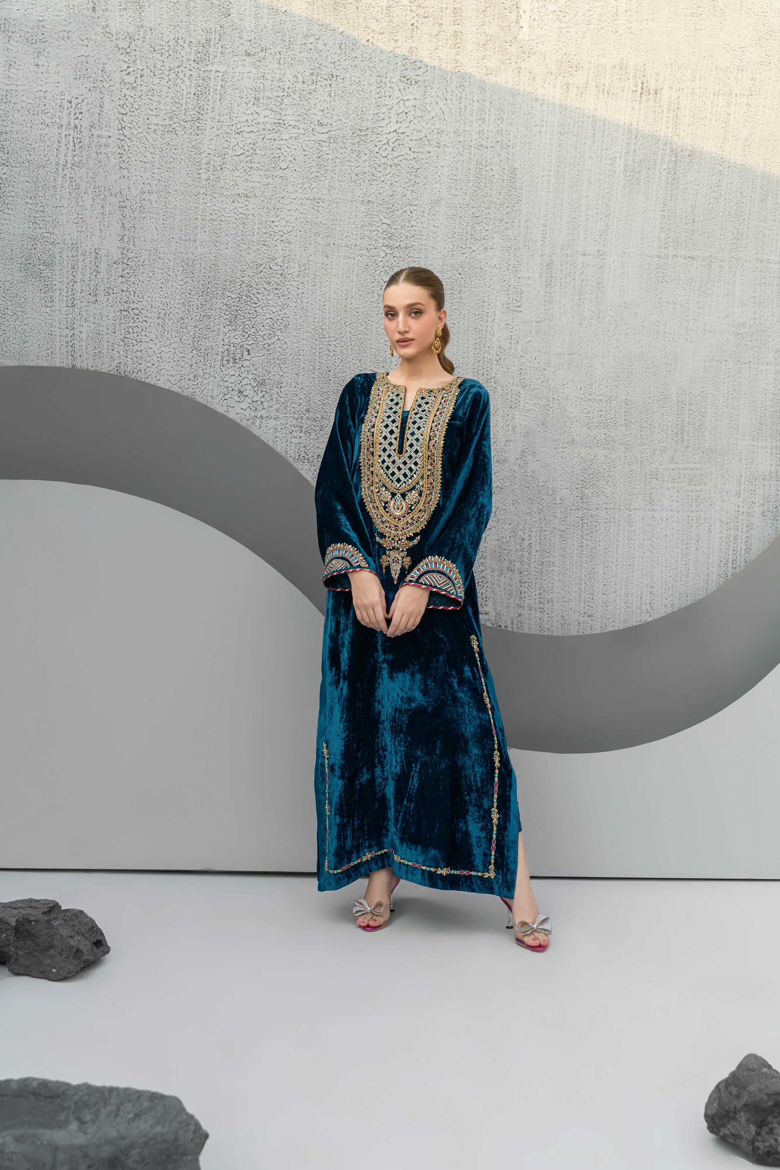 Sapphire is a dusty teal coloured long kaftan style shirt with straight cut pants. It consists of work of dabka, kora and gotta and is worked upon velvet.Ā