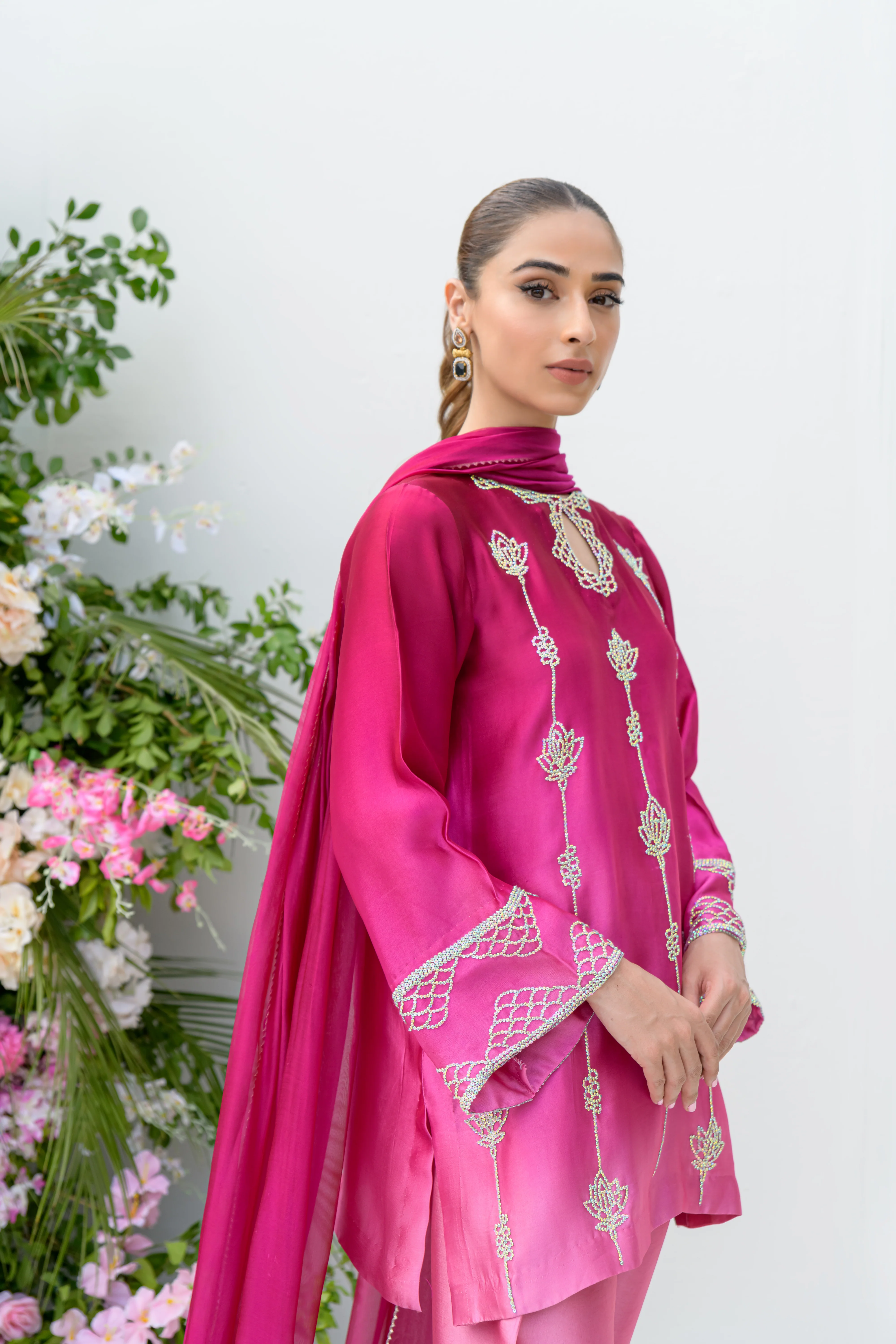 The Shades of Pink ensemble showcases a striking ombre effect in vibrant raspberry pink tones. This modern outfit features a short shirt crafted from luxurious pure sheesha silk, adorned with intricate Swarovski embellishments for a touch of sparkle. The shirt is paired with slim-cut shalwar, creating a sleek and contemporary silhouette. Complementing the ensemble is a dupatta, also embellished with matching stones and detailing, enhancing the overall sophistication. This stylish design is perfect for those seeking a chic and fashionable look.