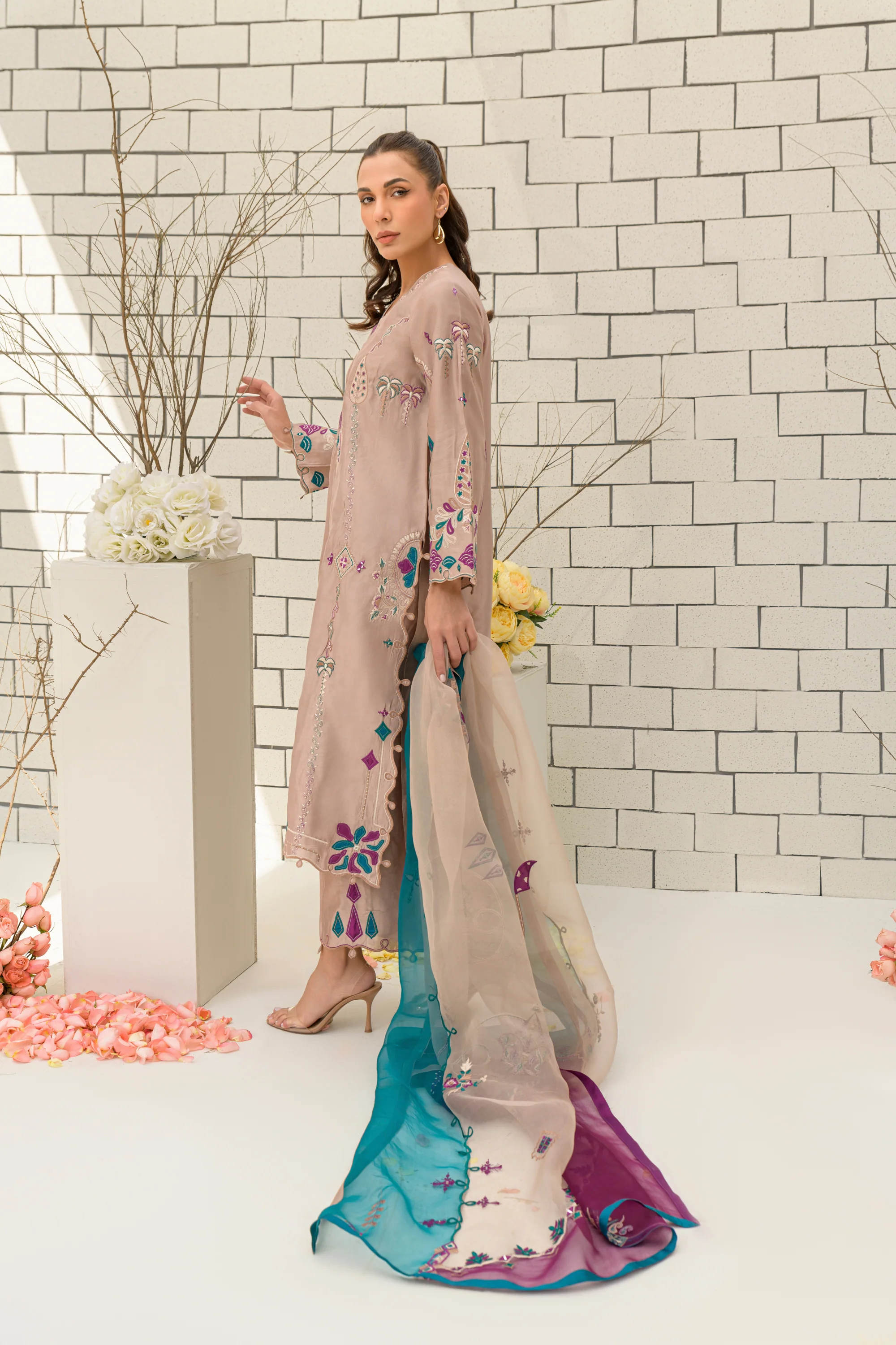 A harmonious blend of dusty beige, teal, and berry plum, Sāmores Latte is an ode to modern elegance. Crafted from premium pure sheesha silk, this ensemble features a long-cut shirt paired with izaar pants, enhanced by a kittan organza dupatta. The design showcases a fusion of intricate applique work, cutwork detailing, and innovative techniques, creating a contemporary yet timeless appeal. Perfect for those who seek a sophisticated statement with a touch of artistic flair.
