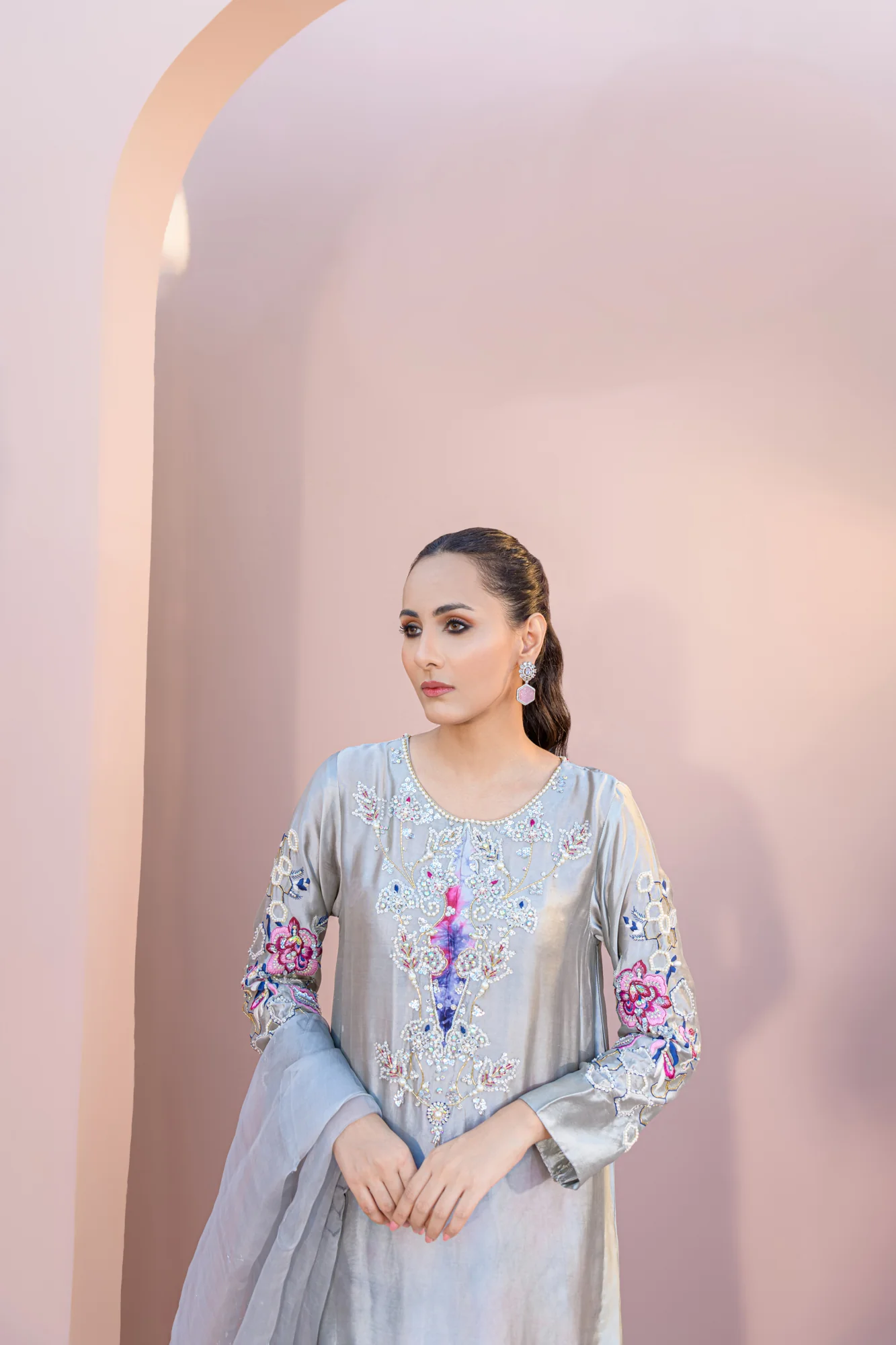 The dress features a soft shade of steel, reminiscent of a steel piece. The top of the dress is adorned with intricate Swarovski crystals and lustrous pearls, adding a touch of sparkle and sophistication. The sleeves of the dress are made of organza fabric, which creates a sheer and ethereal effect. Complementing the dress, the pants are tie-dyed in various shades of purple. The tie-dye technique creates a unique and eye-catching pattern, adding a trendy and fashionable element to the ensemble.
